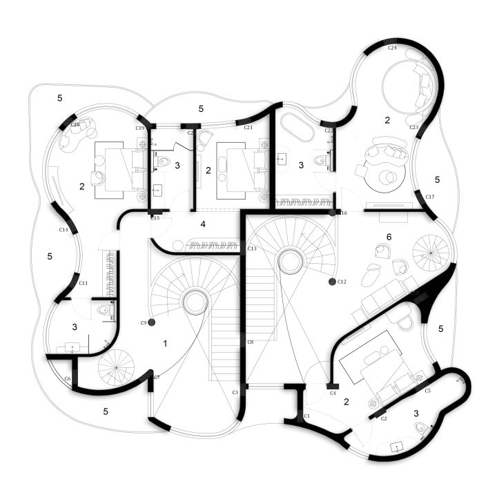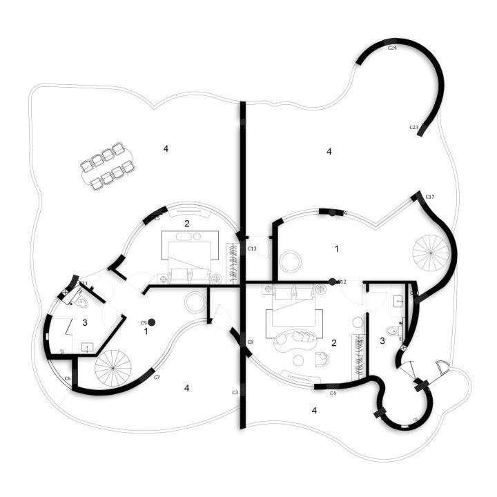 Organic Villa – 2 villas of 4BHK is a distinctive architectural project in Anjuna, Goa, featuring two spacious 4BHK villas designed within a single structure. The design embraces fluid geometry with curved walls and a circular layout, creating a sense of organic movement and spatial harmony. Each villa seamlessly blends contemporary