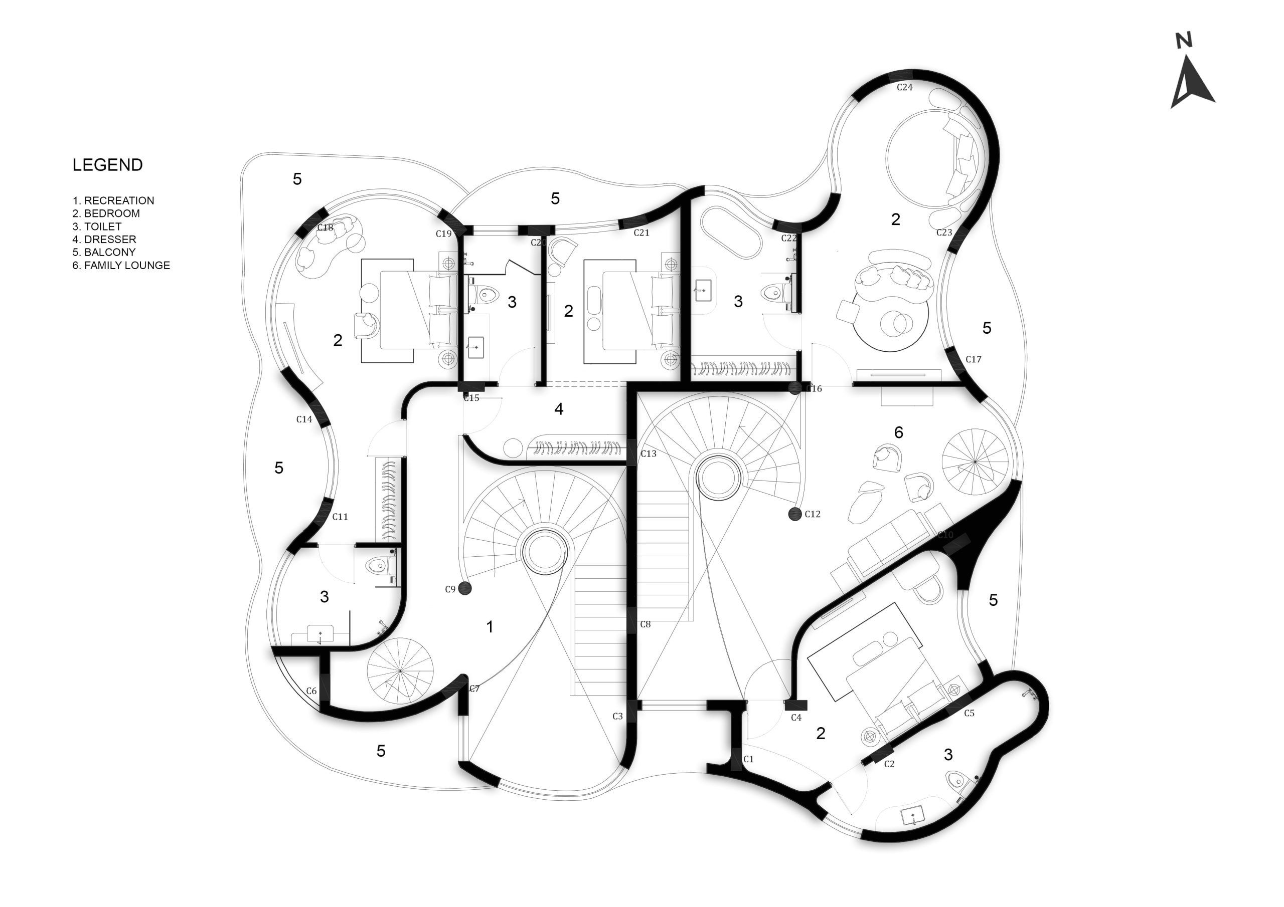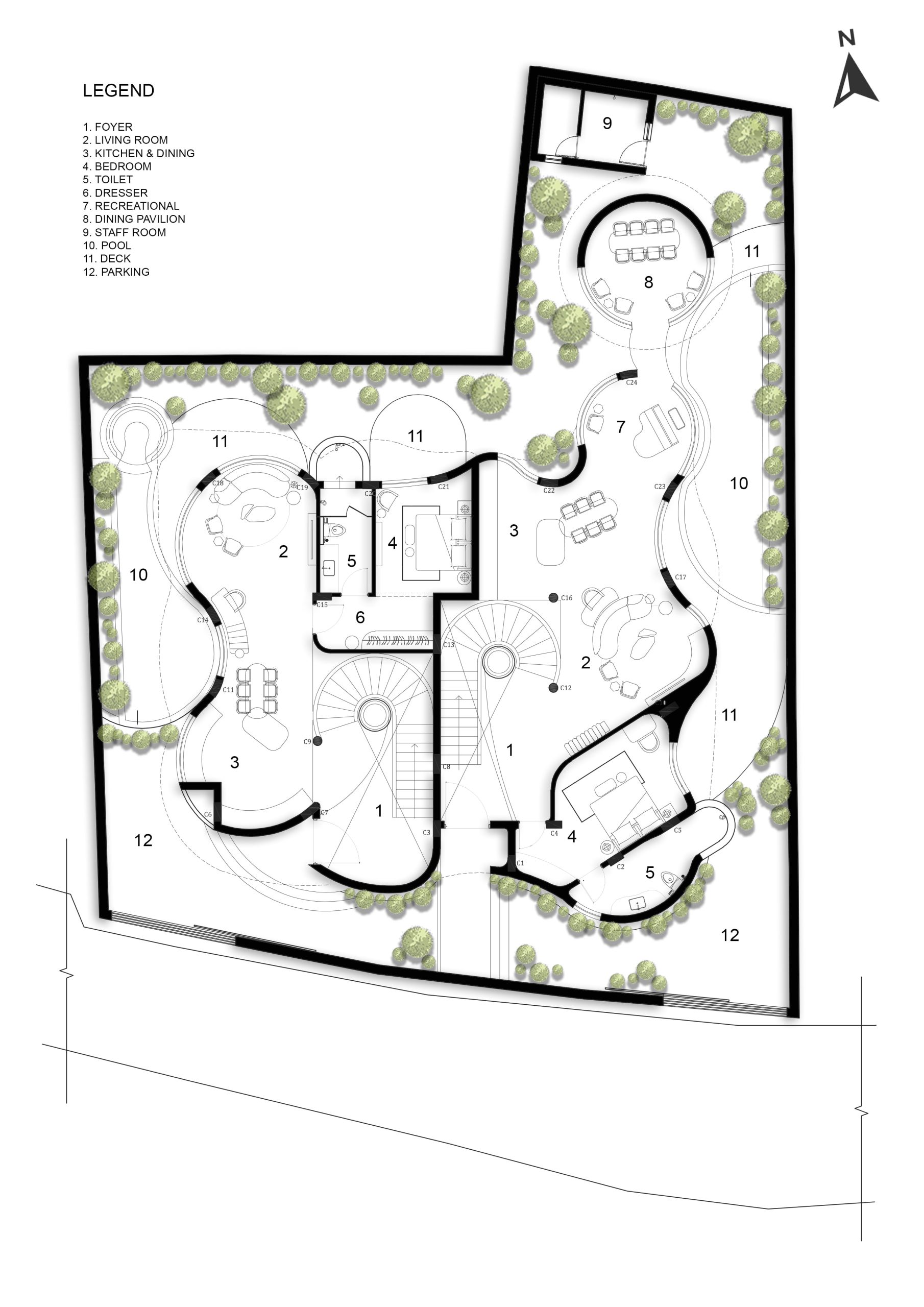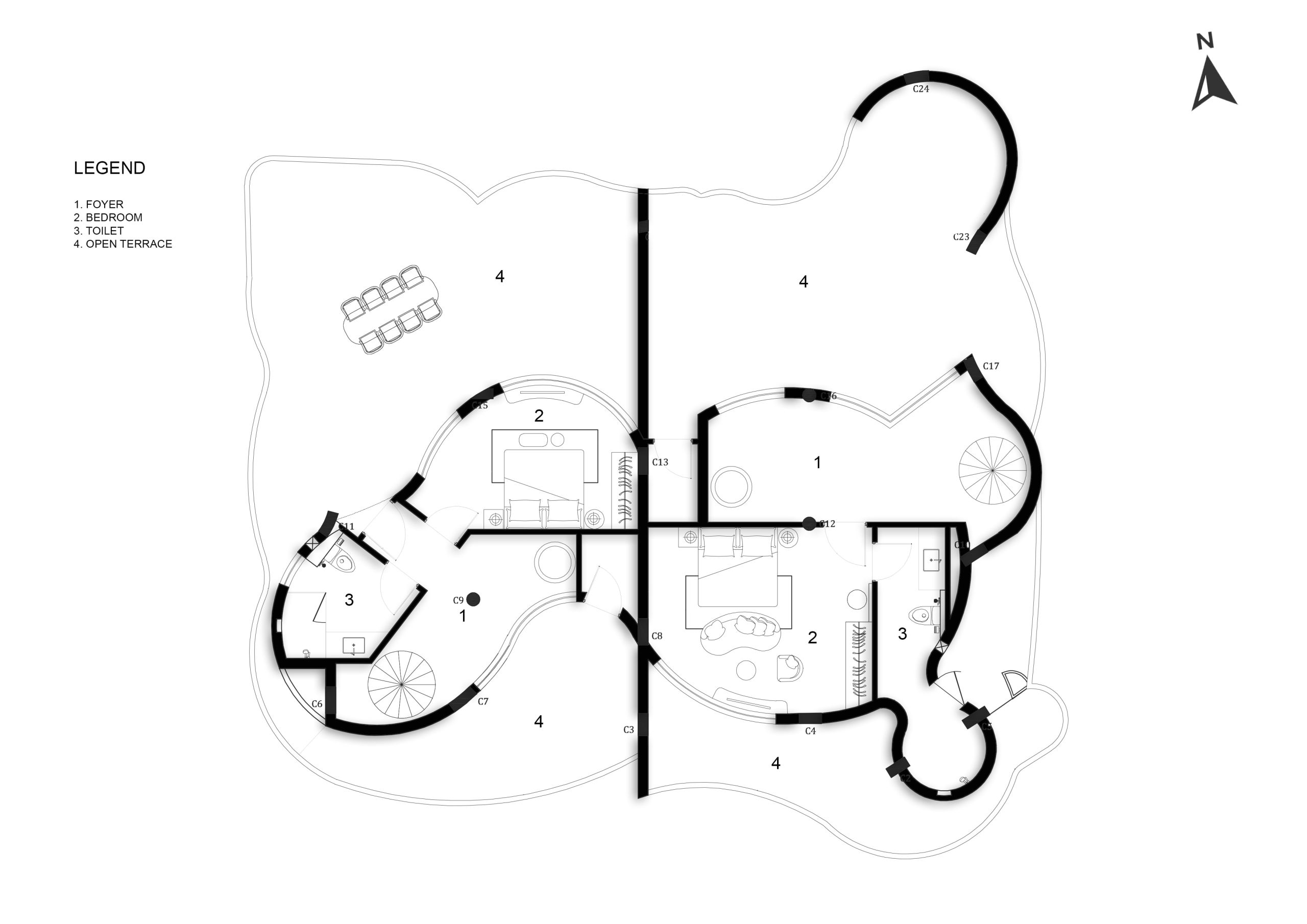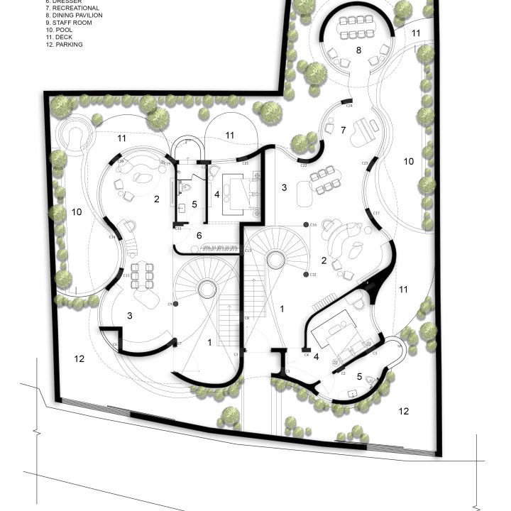 The project posed a challenge of designing within Goan bylaws while achieving maximum space efficiency in a curved circular layout. We resolved this by dividing the form into two independent 4BHK villas, ensuring functional zoning, privacy, and structural balance. The result is a highly optimized and compliant architectural solution